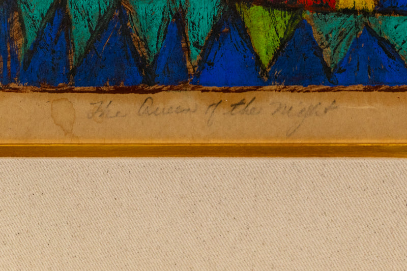 The Queen of the Night, original vintage mid 20th century painting by Denver artist Edward Marecak. The composition depicts a semi abstract woman with a long gown and a crescent shaped headpiece. Oil on paper. Signed by the artist, lower right; Titled lower center. Presented in a custom vintage frame.