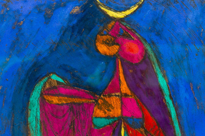 Prior to coming to Colorado, Marecak did watercolors resembling those of Winslow Homer, John Singer Sargent and Charles Burchfield. However, once in Colorado Springs he decided to destroy much of his earlier ouevre, embarking on a totally new direction unlike anything he had previously done. Initially, in the 1940s he was influenced by surrealist imagery and Paul Klee, and in the West by Indian petroglyphs and Kachinas. His first one-person show at the Garrett Gallery in Colorado Springs in 1949 featured paintings and lithographs rendered in the style of Surrealism, Magic Realism & Fantasy and referential abstraction. The pieces, including an oil Witch with Pink Dish, foreshadowed the output of his entire Colorado-based career, distinguished by a dramatic use of color, intricacy of execution and attention to detail contributing to their visual impact. He once observed, "Each time I start a new painting I always fool myself by saying this time keep it simple and not get entangled with such complex patterns, color and design; but I always find myself getting more involved with richness, color and subject matter."