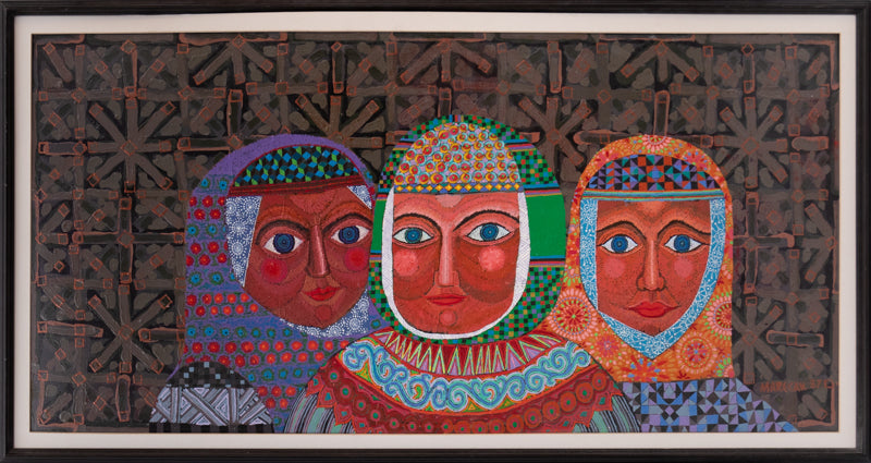 "The Three Fates", original painting by Denver artist Edward Marecak. Abstracted portrait of 3 women representing the three Fates from Greek mythology: Clotho, Lachesis, and Atropos. Acrylic on board. Signed by the artist and dated, 1987, lower right; Titled on reverse. Presented in a custom vintage frame.