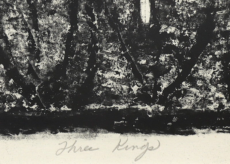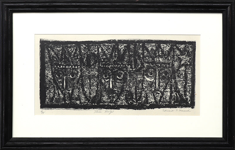 "Three Kings", vintage circa 1948 print by Denver artist Edward Marecak. Abstracted print of three kings in black and white. Lithograph on paper. Signed by the artist, lower right margin; Titled lower center margin; Numbered 4/15 (#4 in a collection of 15 prints), lower left margin. Presented in a custom frame.