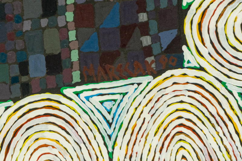 Prior to coming to Colorado, Marecak did watercolors resembling those of Winslow Homer, John Singer Sargent and Charles Burchfield. However, once in Colorado Springs he decided to destroy much of his earlier ouevre, embarking on a totally new direction unlike anything he had previously done. Initially, in the 1940s he was influenced by surrealist imagery and Paul Klee, and in the West by Indian petroglyphs and Kachinas. His first one-person show at the Garrett Gallery in Colorado Springs in 1949 featured paintings and lithographs rendered in the style of Surrealism, Magic Realism & Fantasy and referential abstraction. The pieces, including an oil Witch with Pink Dish, foreshadowed the output of his entire Colorado-based career, distinguished by a dramatic use of color, intricacy of execution and attention to detail contributing to their visual impact. He once observed, "Each time I start a new painting I always fool myself by saying this time keep it simple and not get entangled with such complex patterns, color and design; but I always find myself getting more involved with richness, color and subject matter."