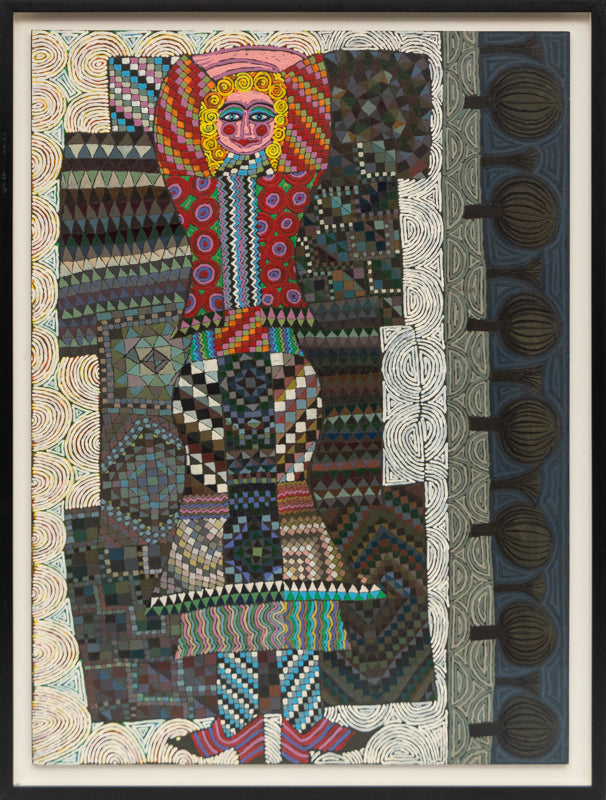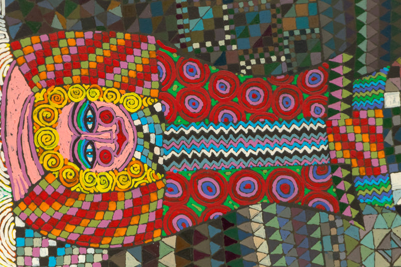 Untitled (Lady Laying in the Park), original painting by artist Edward Marecak. Composition featuring a figure of a woman, rendered in a style reminiscent of a quilt. Acrylic on board. Signed by the artist and dated, 1990, lower right. Mounted with an archival masonite board and floated in a custom frame.