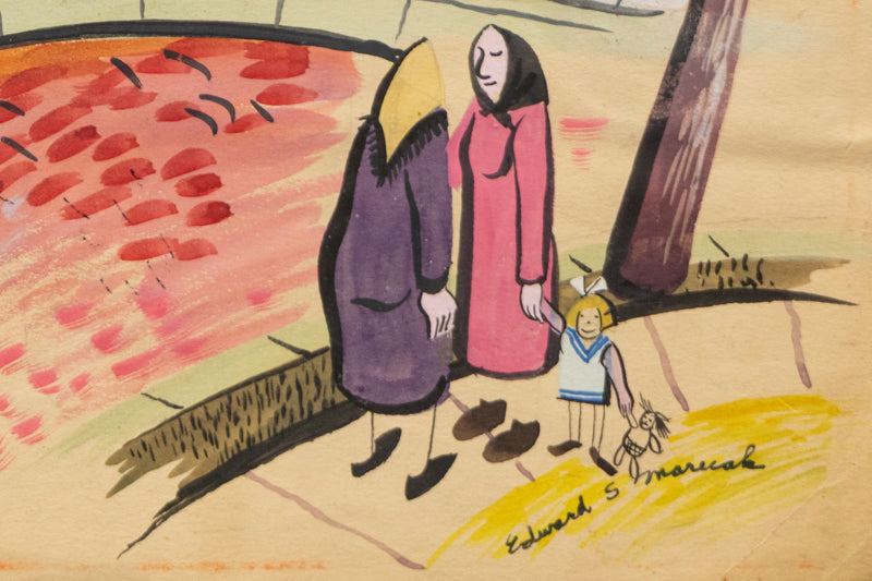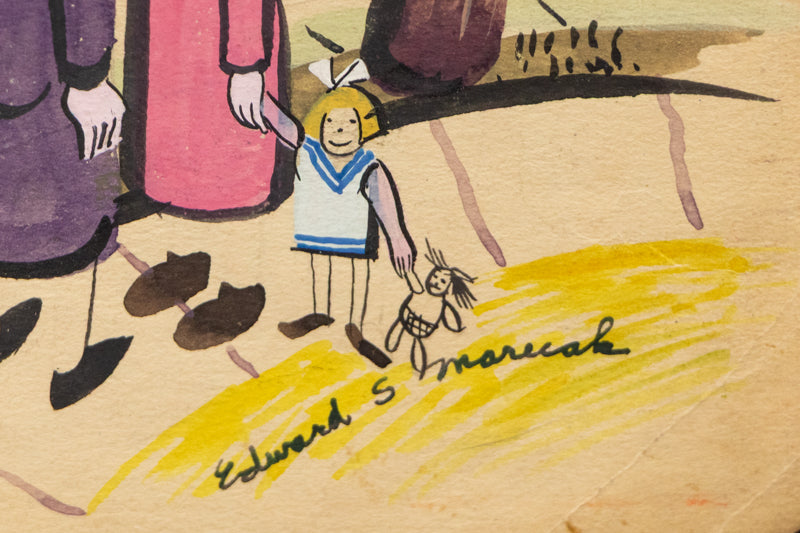 Original vintage street scene by Denver artist Edward Marecak. The composition depicts a street lined by colorful houses and women strolling on the sidewalks. Watercolor on paper. Signed by the artist, lower right. Unframed, custom framing options available.