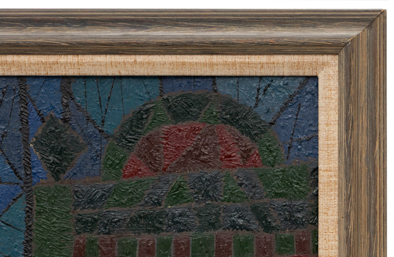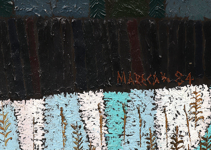 "Winter Witch #2", original painting by artist Edward Marecak. Nocturnal scene of an abstracted female figure and a quiet moonlit town. Oil on board. Signed by the artist and dated, 1984, lower right; Titled on reverse. Presented in a custom frame.
