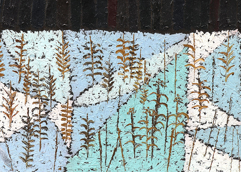An idiosyncratic artist proficient in oil, acrylic, watercolor, gouache and casein, he did not draw upon Colorado subject matter for his work, unlike many of his fellow painters in the state. Instead he used Midwest landscape imagery, bringing to life in it witches and spirits adapted from the Slovakian folk tales he heard growing up in Ohio. A number of his paintings depict winter witches derived from the Slovak custom in the Tatra Mountains of burning an effigy of the winter witch in the early spring to banish the memory of a hard winter. The folk tale element imparts a dream-like quality to many of his paintings.