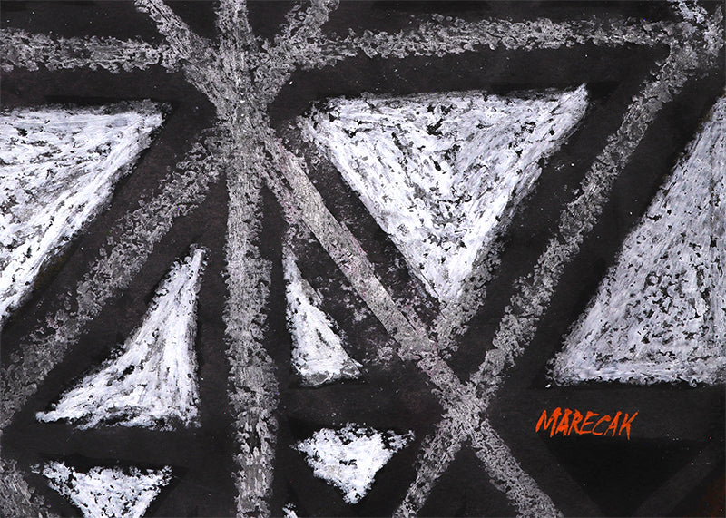 Prior to coming to Colorado, Marecak did watercolors resembling those of Winslow Homer, John Singer Sargent and Charles Burchfield. However, once in Colorado Springs he decided to destroy much of his earlier ouevre, embarking on a totally new direction unlike anything he had previously done. Initially, in the 1940s he was influenced by surrealist imagery and Paul Klee, and in the West by Indian petroglyphs and Kachinas. His first one-person show at the Garrett Gallery in Colorado Springs in 1949 featured paintings and lithographs rendered in the style of Surrealism, Magic Realism & Fantasy and referential abstraction. The pieces, including an oil Witch with Pink Dish, foreshadowed the output of his entire Colorado-based career, distinguished by a dramatic use of color, intricacy of execution and attention to detail contributing to their visual impact. He once observed, "Each time I start a new painting I always fool myself by saying this time keep it simple and not get entangled with such complex patterns, color and design; but I always find myself getting more involved with richness, color and subject matter."