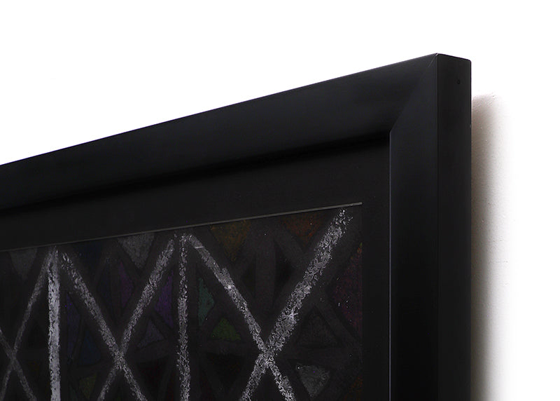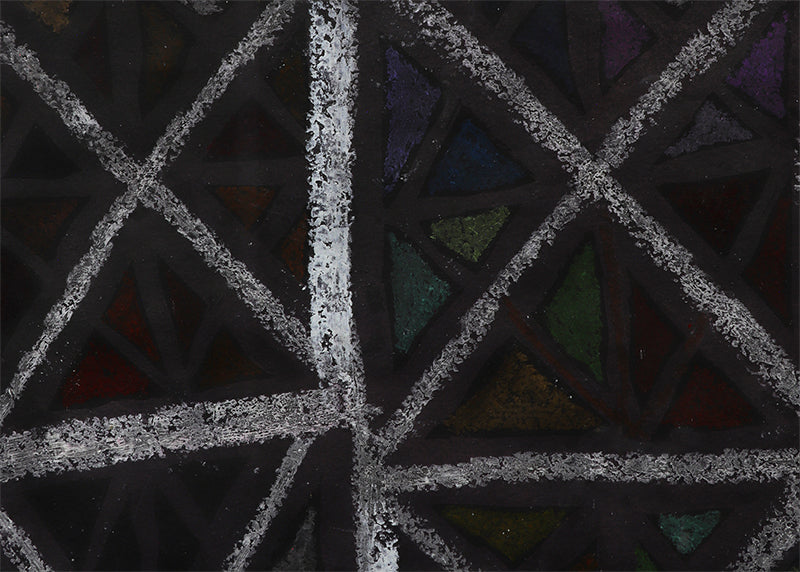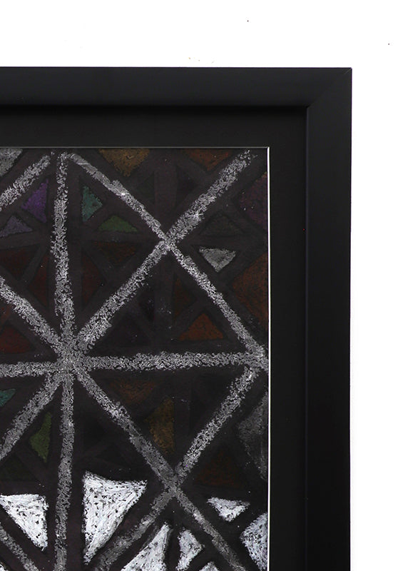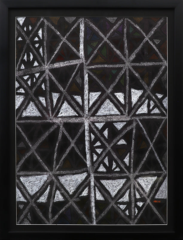X Marks the Spot, original circa 1960s mixed media painting by Denver artist Edward Marecak. Abstract with a lattice pattern in shades of white, gray, and black. Beneath the lattice, impressions of multicolored stained glass can be seen. Acrylic and pastel on paper. Signed by the artist, lower right. Presented in a custom frame with archival materials.