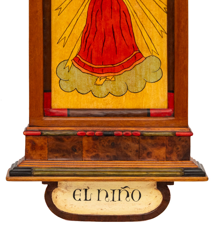 "El Nino", original Retablo painting by Colorado artist Michael Blatnik. Conteporary painting in the style of the Spanish Colonial Santeros of New Mexico depicting an single angelic infant on a cloud. Signed by the artist and dated, 2021, on reverse. Acrylic on wood. Presented in a custom handcarved frame by the artist.