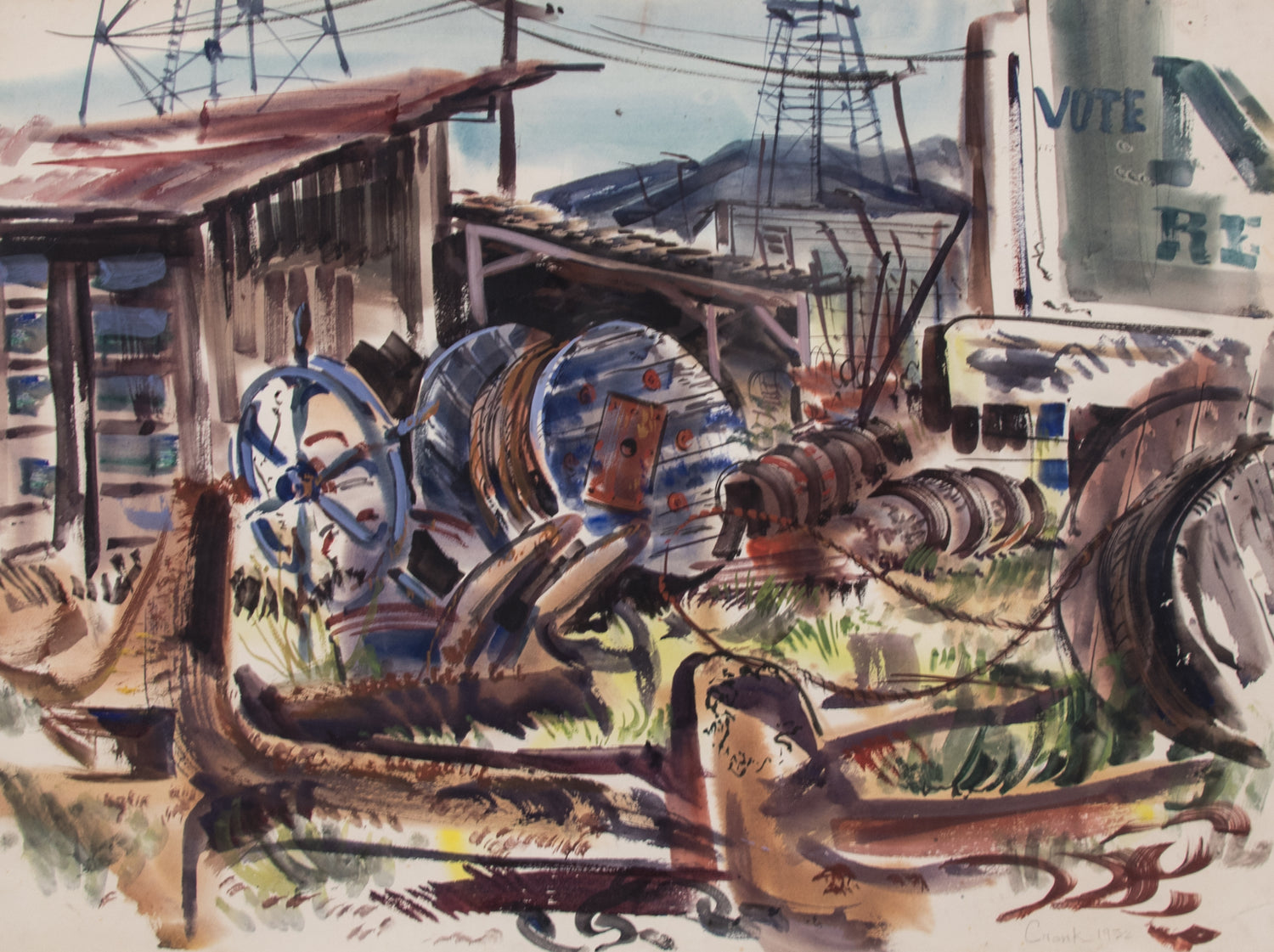 Original vintage mid 20th century painting by artist Frances Marian Cronk. Modernist composition depicting a salvage yard with buildings, towers, and mountains in the background. Watercolor on paper. Signed by the artist and dated, 1952, lower right. Presented in a custom frame.