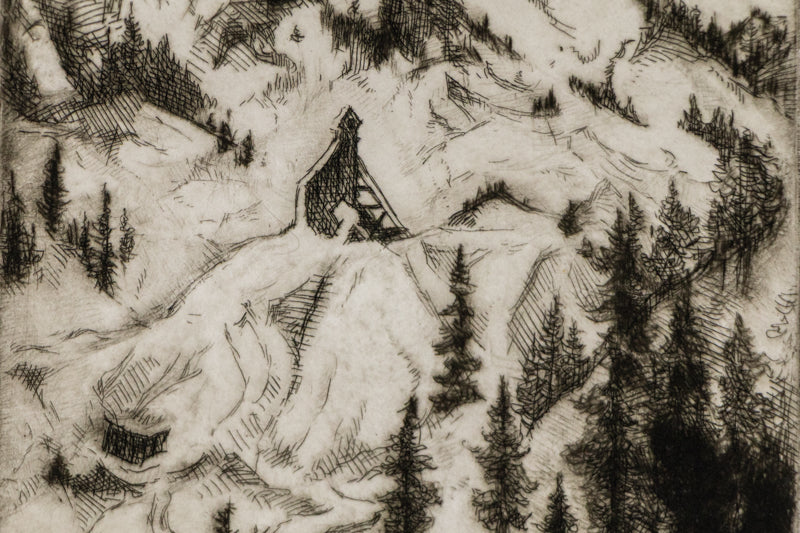 "Red Mountain Relic," original etching with drypoint by artist Gene Kloss. Composition depicts Red Mountain, which is located between Ouray and Silverton, not far from Telluride, Colorado. Signed in pencil by the artist, lower right; Titled and numbered 27 in an edition of 50 engravings, lower left. Presented in a custom frame with UV70 protectant glass.