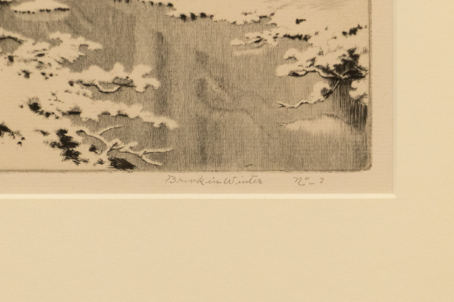 Drypoint etching of trees and a creek blanketed in snow. Signed and titled in pencil by the artist. Presented in a new custom frame with UV70 protectant glass. Seeber #273.