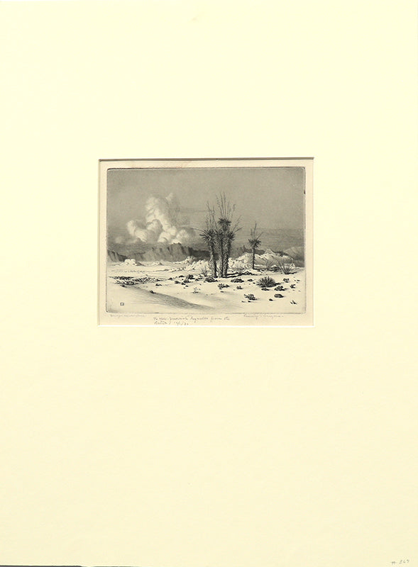 Drypoint Etching of a southwestern desert landscape with Soaptree Yucca in the foreground, buttes and rock formations and clouds in the background. Signed in pencil by the artist and inscribed "To Mrs. Frederick Reynolds from the Artist, 12/1/30" and "Evening - Arizona". Presented in an archival mat, custom framing services are available. Seeber #367.