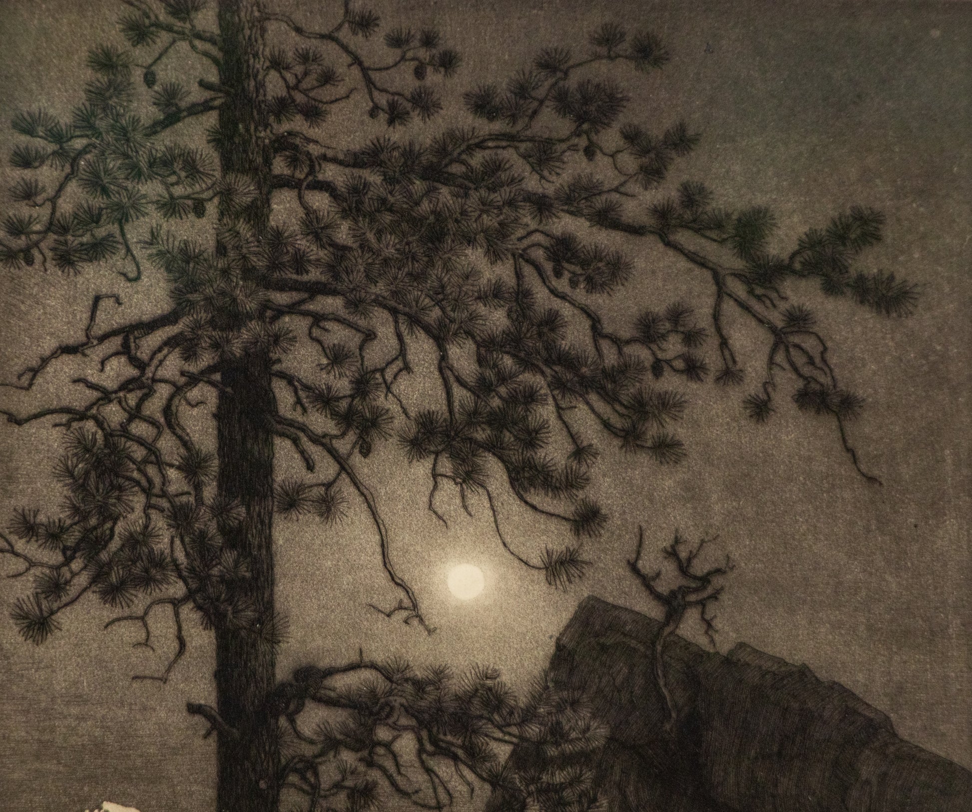 Aquatint etching, a night view of a pine tree and full moon with snowy mountain peaks in or near Rocky Mountain National Park, Colorado. Signed in pencil by the artist and titled "Misty Moonlight - Estes Park - Colo", numbered "12/75" (no. 12 in an edition of 75 engravings). Presented in an archival mat, custom framing services are available. Seeber #280.