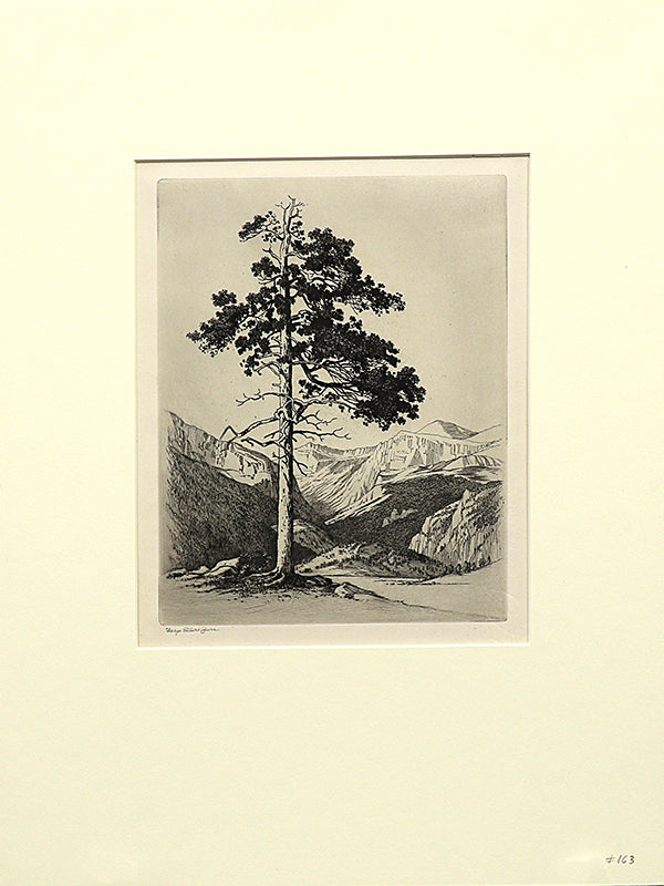 Drypoint Etching with a lone pine tree in a mountain landscape with snowy peaks from Moraine Park, Rocky Mountain National Park, Colorado. Signed by the artist in pencil. Alternate title: Moraine Park [no. 1]. From the artist's "Mountain Moods" series of 16 etchings. Presented in an archival mat, custom framing services are available. Seeber #163.
