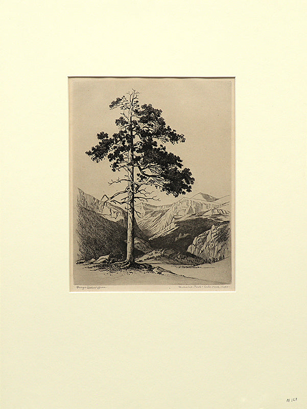Drypoint Etching with a lone pine tree in a mountain landscape with snowy peaks from Moraine Park, Rocky Mountain National Park, Colorado. Signed by the artist in pencil and inscribed, "Moraine Park - Estes Park - Colo -". Alternate title: Moraine Park [no. 1]. From the artist's "Mountain Moods" series of 16 etchings. Presented in an archival mat, custom framing services are available. Seeber #163.
