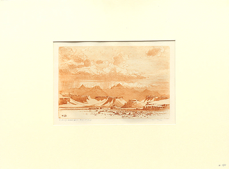 Aquatint Etching, signed by the artist in pencil and inscribed "Del. et Imp." and numbered 26/40 (No. 26 of an edition of 40). Part of the artist's "Desert Set" series. Presented in an archival mat, custom framing services are available. Seeber #190.