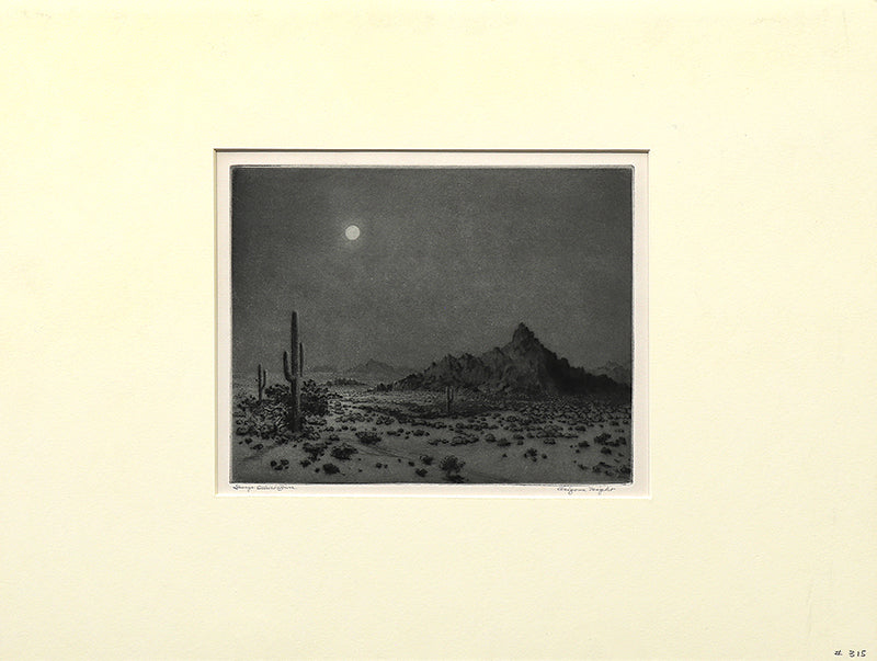 Drypoint etching of the Needles rock pinnacles in arizona, set within a nocturnal desert landscape with Saguaro cactus and other cacti all under a night sky with full moon. Signed by the artist in pencil and titled, "Arizona Night". Presented in an archival mat, custom framing services are available. Seeber #315.