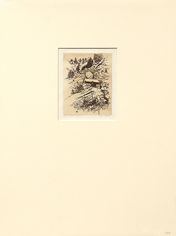 Etching of the artist's cabin on a hillside with rock outcroppings, pine trees and foliage. Near Estes Park and Rocky Mountain National Park, Colorado. Signed by the artist in pencil and inscribed "Del. et Imp." Presented in an archival mat, custom framing services are available. Seeber #108.