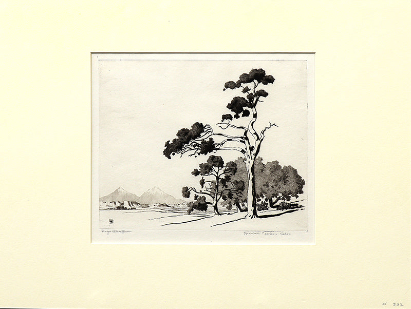 Etching of a Southwestern landscape with trees with the Spanish Peaks of Colorado in the background. Signed in pencil by the artist and inscribed, "Spanish Peaks - Colo-". Presented in an archival mat, custom framing services are available. Seeber #332.