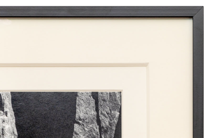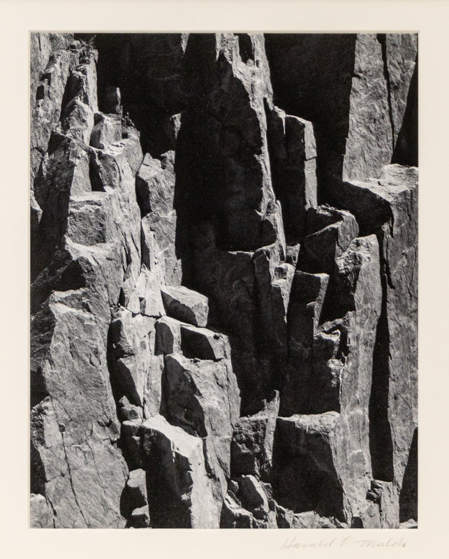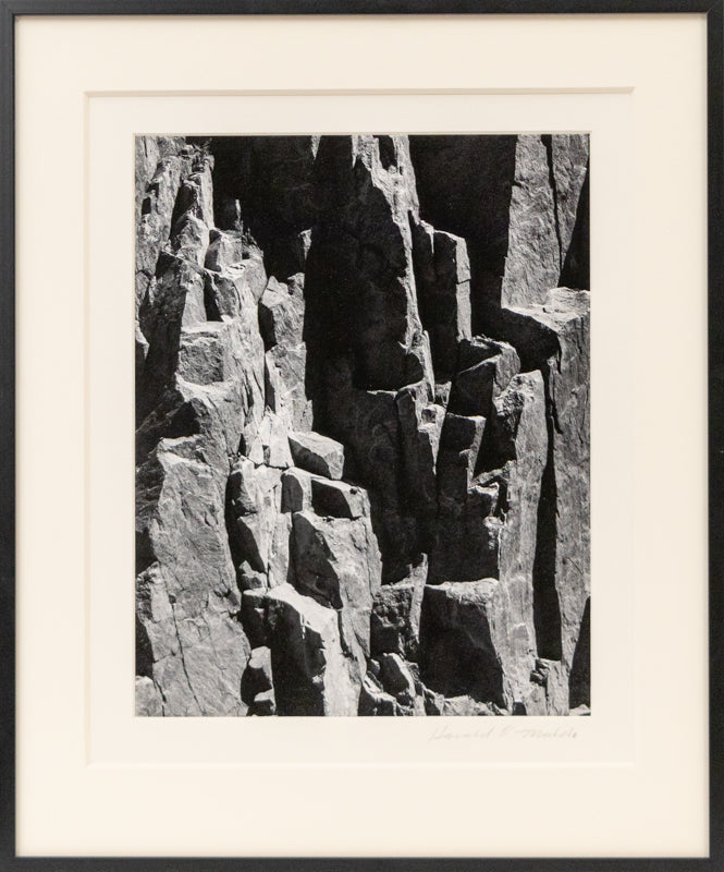 Black and white photograph by Harold E. Malde (1923-2007) titled Rock Cut Boulder (Boulder, Colorado) circa 1960. Arist signed lower right and titled verso. Anglular view of the rock edge of Boulder Creek. Presented in a custom frame measuring with all archival materials with outer dimensions measuring 19 ¾ x 16 ½ inches; image size is 13¼ x 10 ¼ inches.