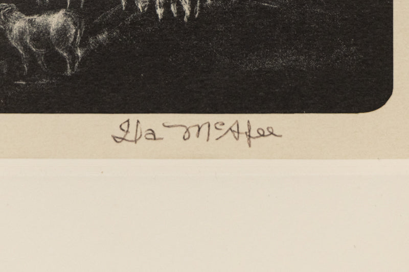 Small Ranch, original fine art print by artist Ila Mae McAfee. Heavily inked, the composition depicts a mountain valley with a river and sheep in the foreground, a horse and plow in the midground, and an adobe house in the background. Lithograph on paper. Signed by the artist, lower right; Titled lower left. Presented in a new custom frame with an 8 ply mat and UV70 protectant glass.