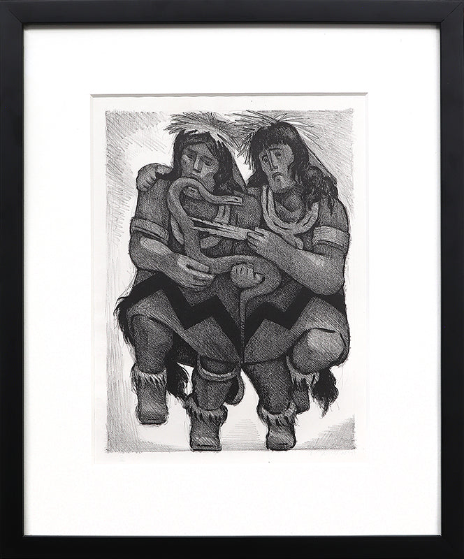 Indian Snake Dance, original vintage fine art print by artist Jean Charlot. Composition depicting two Native American figures dancing with a snake. Lithograph on paper. Signed by the artist, lower right; Embossed lower left; Titled lower left margin. Presented in a custom frame with archival materials.