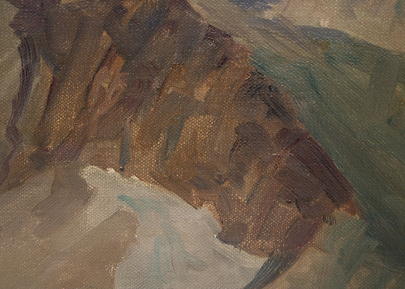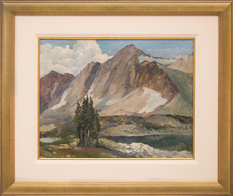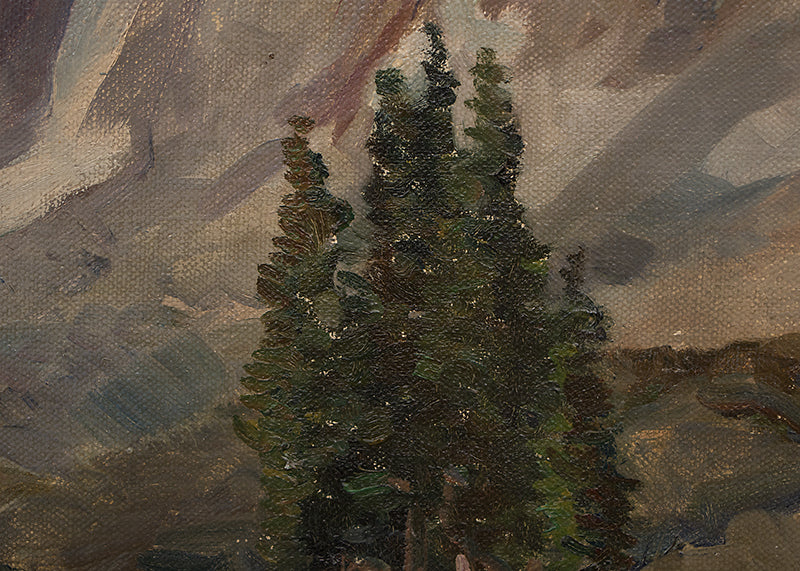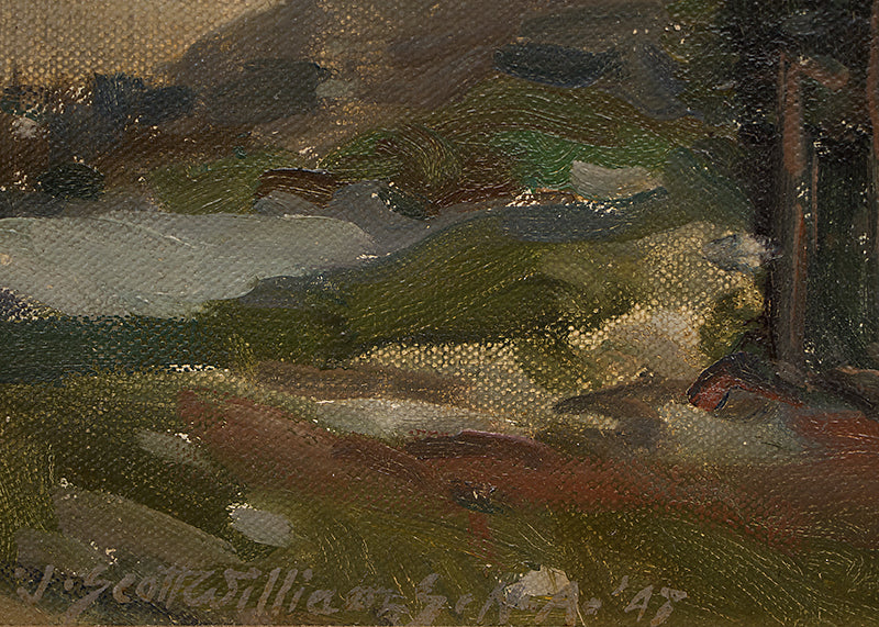 Original vintage mountain landscape painting by artist John Scott Williams. The composition depicts an alpine lake with pine trees and mountain peaks above. Oil on board. Signed by the artist and dated, 1947, lower left. Presented in a custom frame.