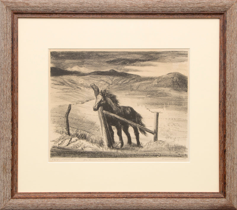 Forgotten, original vintage fine art print by artist Lawrence Barrett. The black and white composition depicts a lone horse in a modernist western landscape (likely Colorado). Signed by the artist, titled, and dated, 1943, lower margin. Numbered 53 of 80 prints and inscribed in pencil: "For Heinie and Helen - L.B. 1943". Presented in a custom frame.