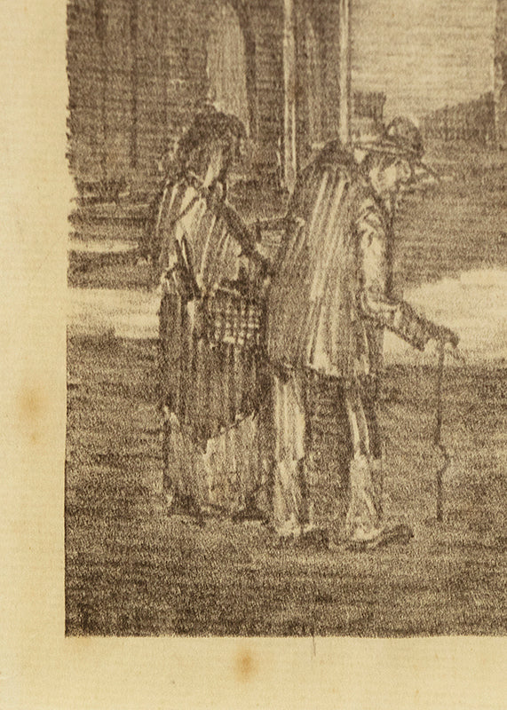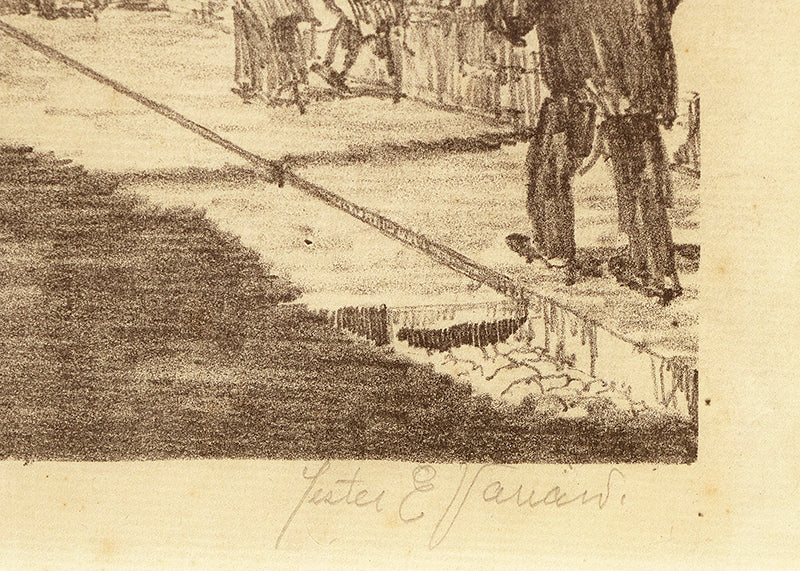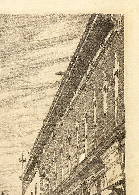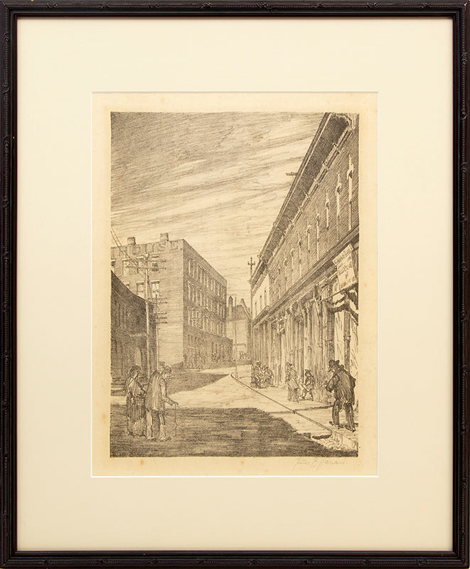 Original vintage print by Denver artist Lester E. Varian (1881-1967). Composition depicting a 1930s street scene with multiple figures bustling about the street and its storefronts. Lithograph on paper. Signed by the artist, lower right. Presented in a custom frame.