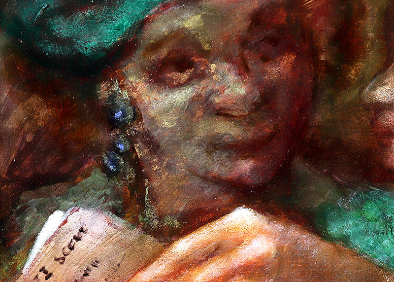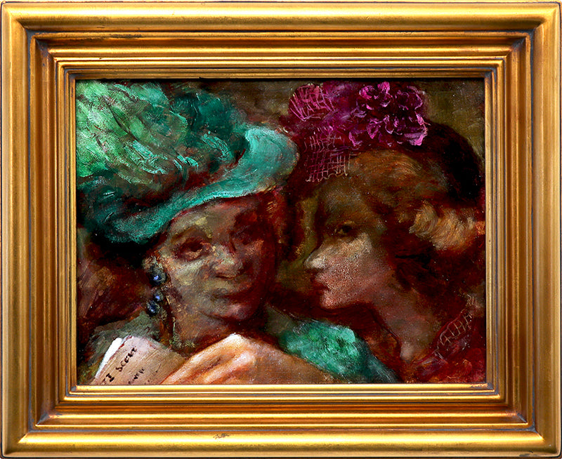 Opera Matinee, original circa 1948 painting by Colorado Springs artist Lewis Lee Tilley (1921-2005). Portrait of two ladies whispering to each other as they attend an opera performance. Oil on panel. Presented in a custom frame.