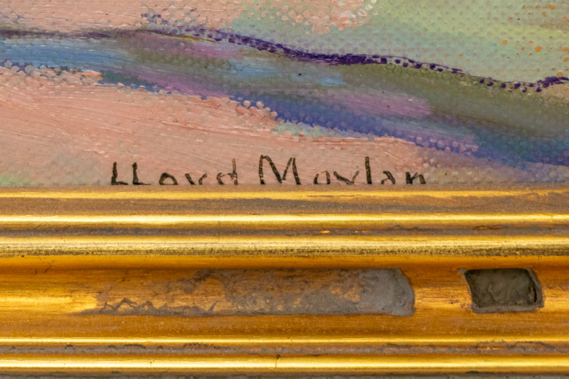 Original vintage 1930s - 1940s oil painting by Broadmoor Art Academy artist and instructor Lloyd Moylan. A street view of the Adams Crossing area of Colorado Springs with chickens, a grocery storefront, and several figures with trees in the background. Oil on canvas. Presented in a custom hand-carved gold leaf frame.
