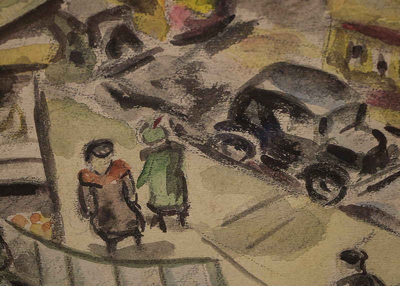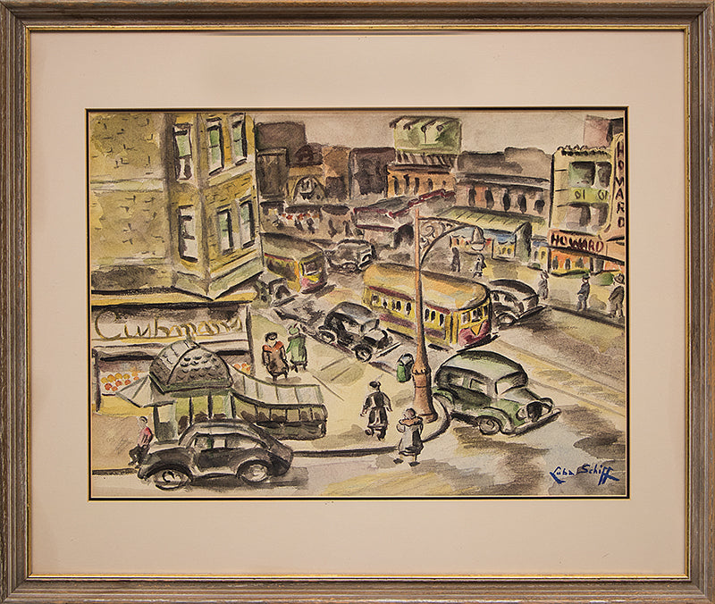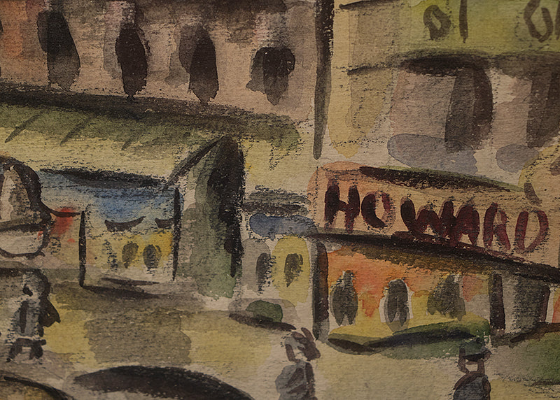 Rendered in a modernist style, this composition most likely depicts a view of State Street at Quincy in Chicago with the Howard store in the background, circa 1940. Gouache on paper. Signed by the artist, lower right. Presented in a custom vintage frame.