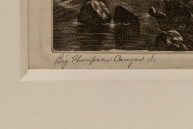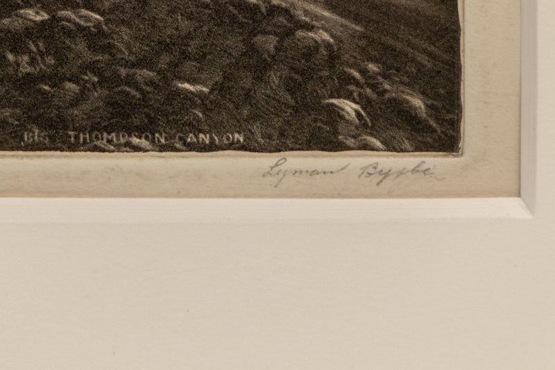 Big Thompson Canyon 1/1, original ethcing by Colorado artist Lyman Byxbe. Landscape depicting the Thompson Canyon and the Big Thompson River between Estes Park and Loveland, Colorado. Etching on paper. Signed by the artist, lower right; Titled and numbered lower left; Titled within plate. Presented in a custom frame with an 8 ply mat and UV70 protectant glass.