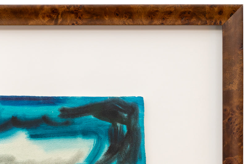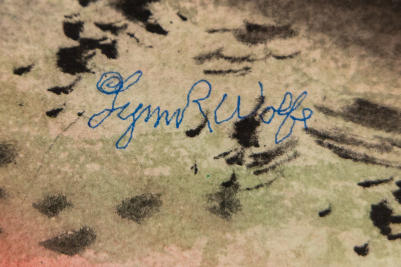 Original watercolor painting by artist Lynn R. Wolfe. Semi abstract landscape depicting a road leading up to a towering mountain peak. Watercolor on paper. Signed by the artist, lower center. Presented in a new custom frame.