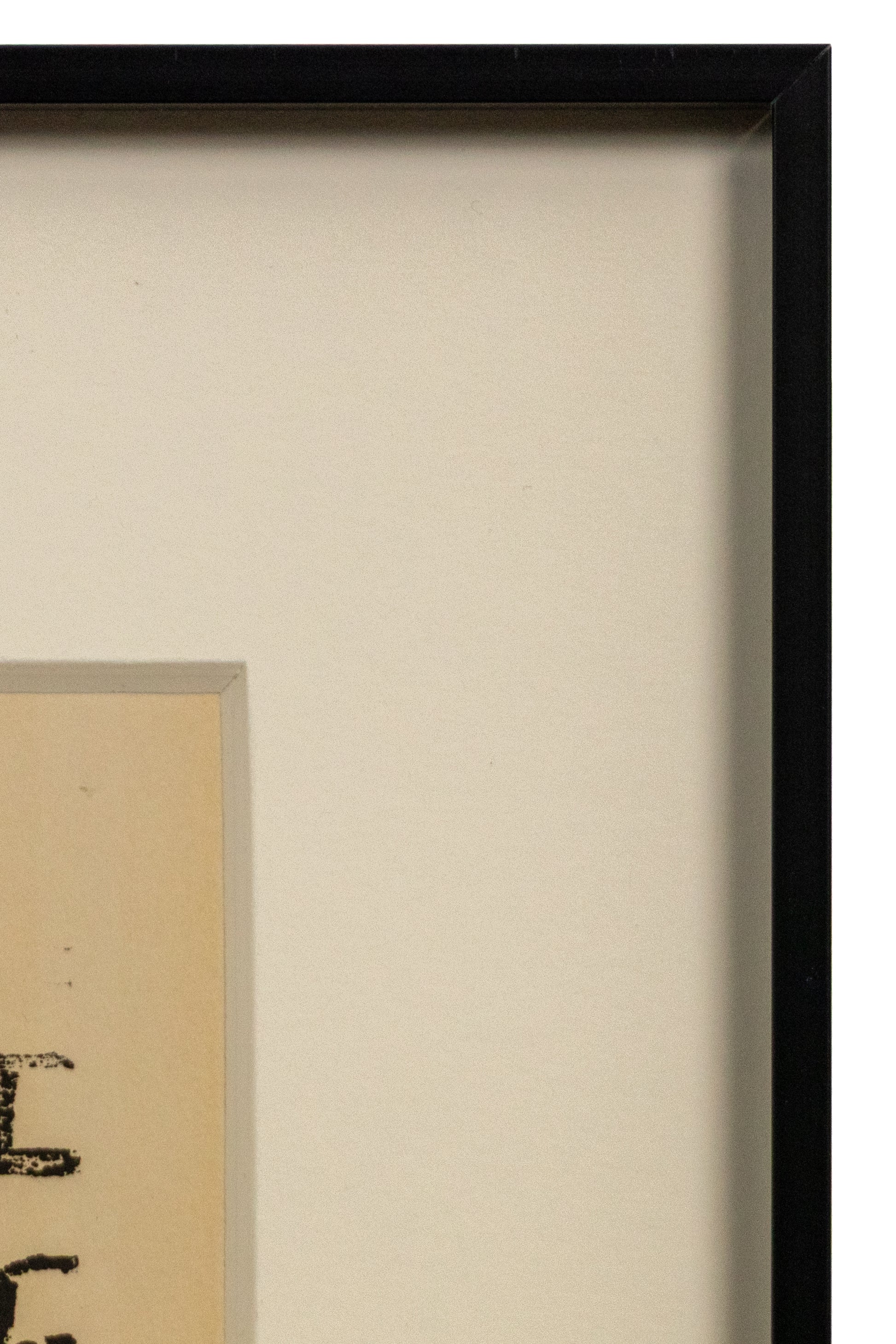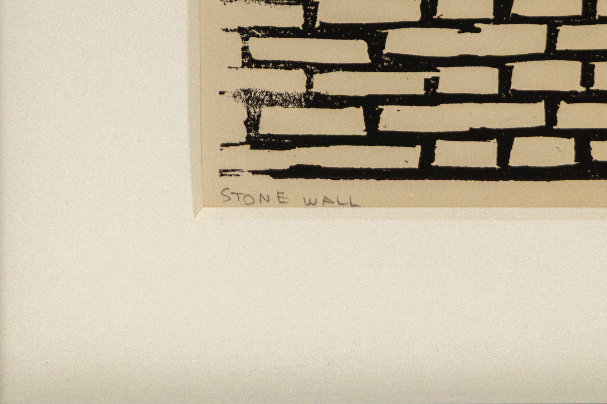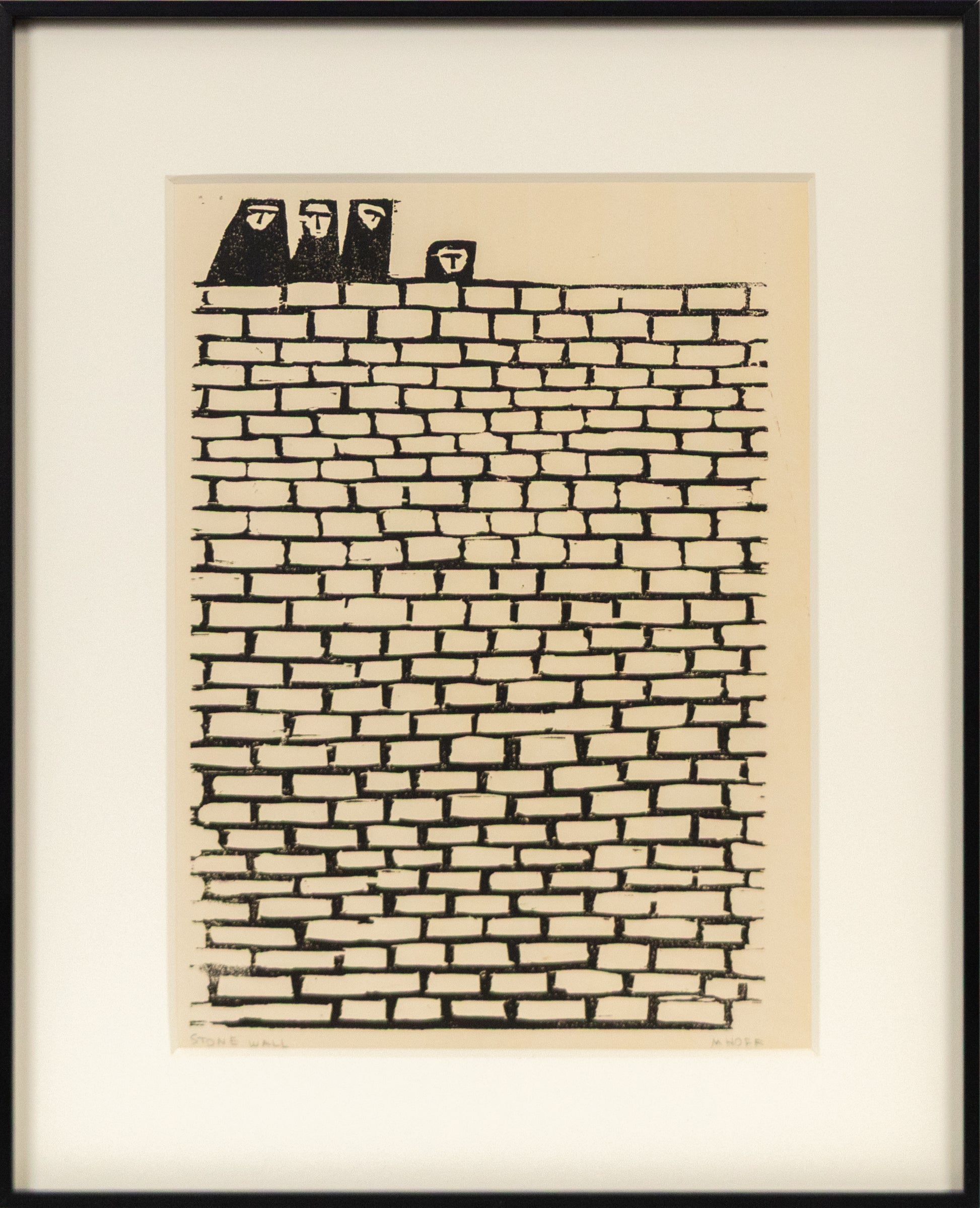 Stone Wall, original fine art print by artist Margo Hoff. Black and white composition depicting four people peering over a high brick wall. Woodblock on paper. Signed by the artist, lower right; Titled lower left. Presented in a new custom frame with an 8 ply archival matt and UV70 protectant glass.