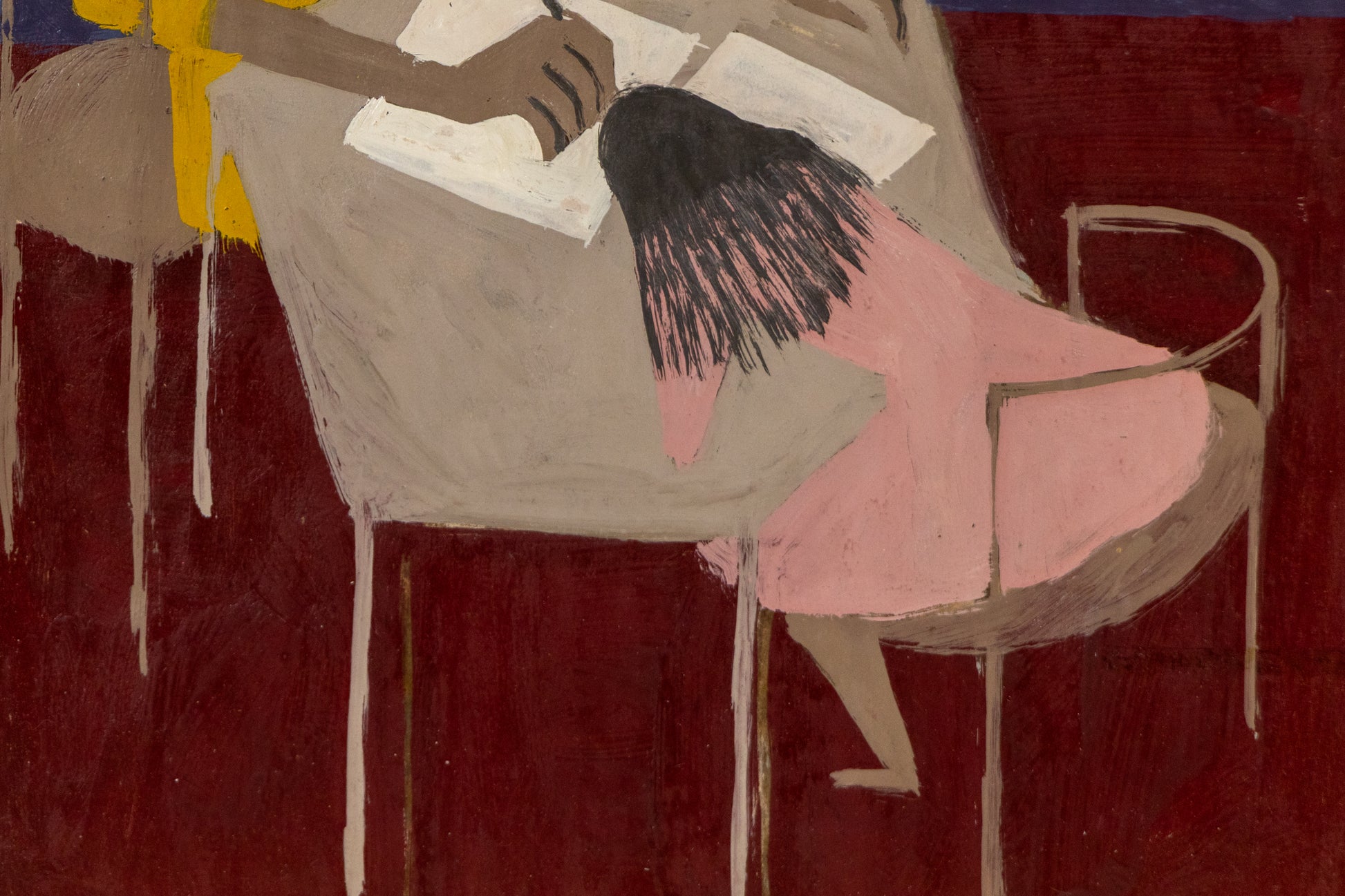 The Lesson, 8, original painting by artist Margo Hoff. The composition depicts the simplified figures of a man and a young girl sitting together at a table. Casein on paper. Signed by the artist, titled, and numbered on reverse. Presented in a new custom frame with an 8 ply archival matt and UV70 protectant glass.