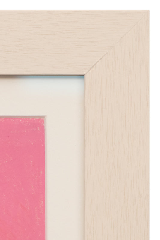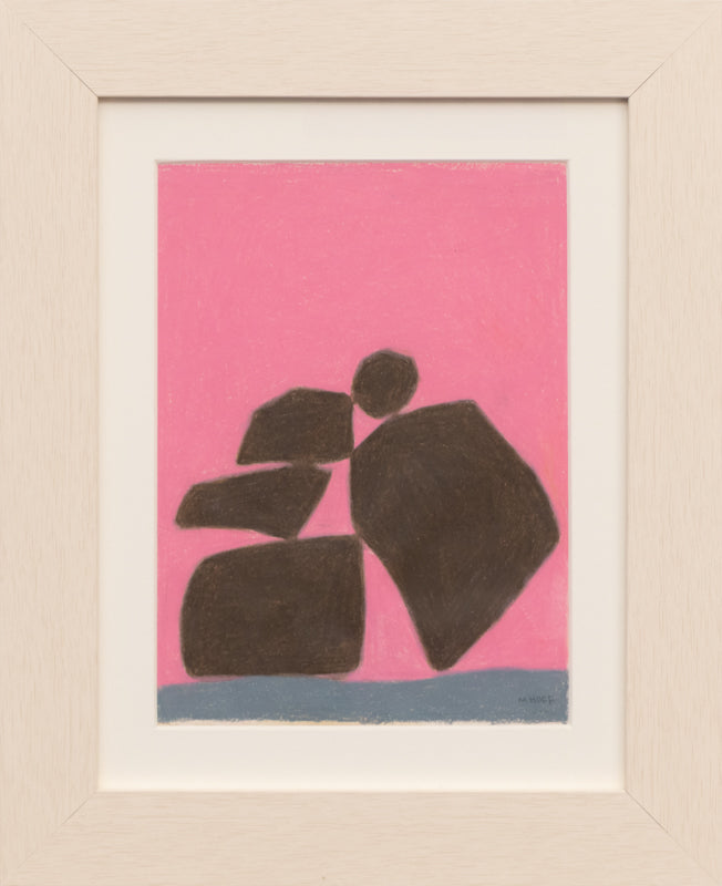 Untitled (Stacked Stones Series), original mixed media drawing by artist Margo Hoff. Abstract composition in colors of pink, brown, and gray. Pencil and crayon on paper. Signed by the artist, lower right. Presented in a custom white frame with an archival mat and UV 70 protectant glass.