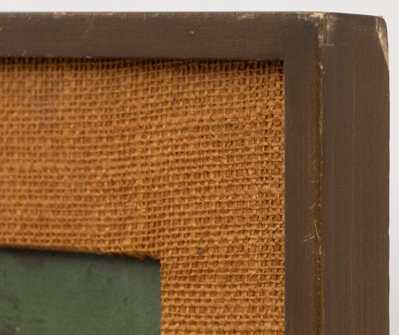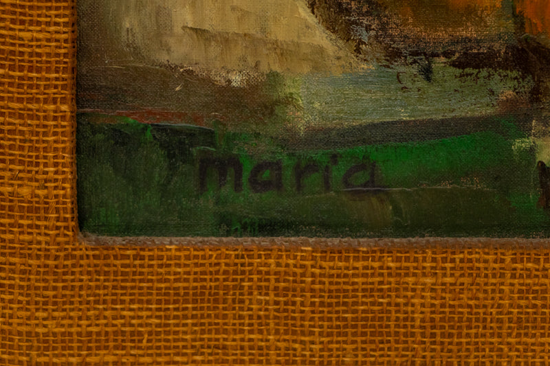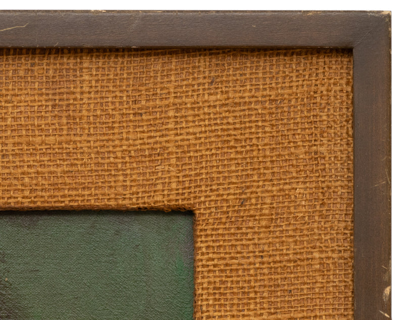 Still Life (#10) by artist Maria Lowenstein. Semi abstracted still life painting of some jugs, bottles, and fruit. Composition is cast in shades of green, orange, amber, and brown. Oil on board. Signed by the artist, lower right, and titled on reverse. Presented in a custum vintage frame.