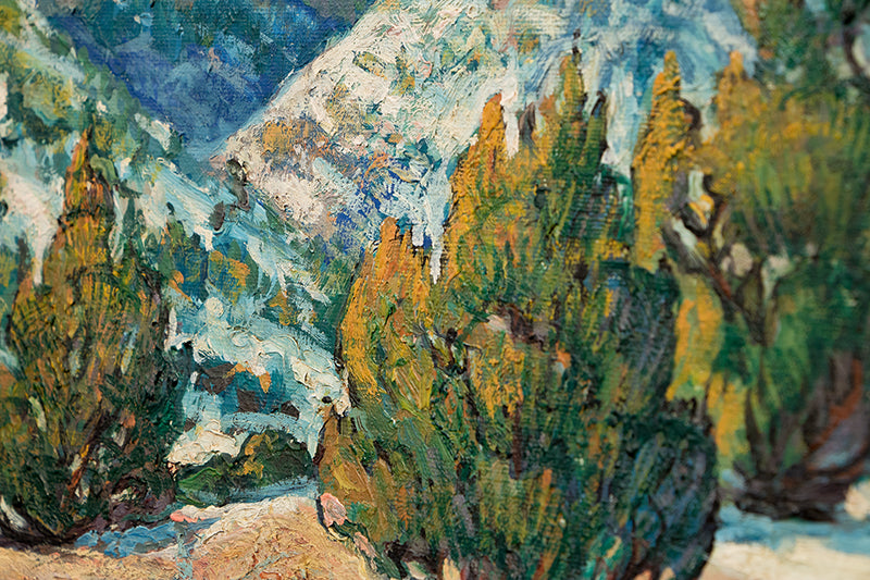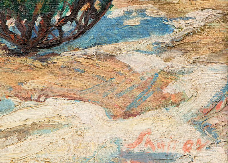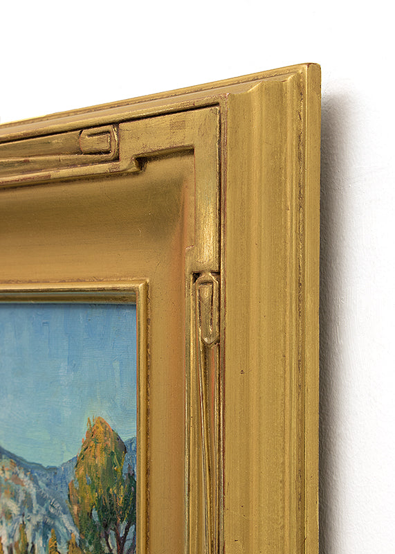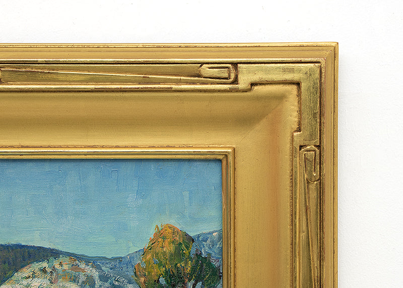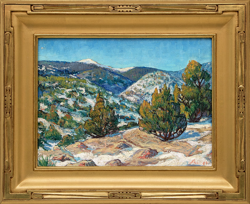 Taos Landscape, original vintage circa 1950 painting by artist Martin Shaffer. The composition depicts a Northern New Mexico landscape with snow, mountains, and Pinyon trees. Oil on artist board. Signed by the artist, lower right. Presented in a custom handcarved gold leaf frame.