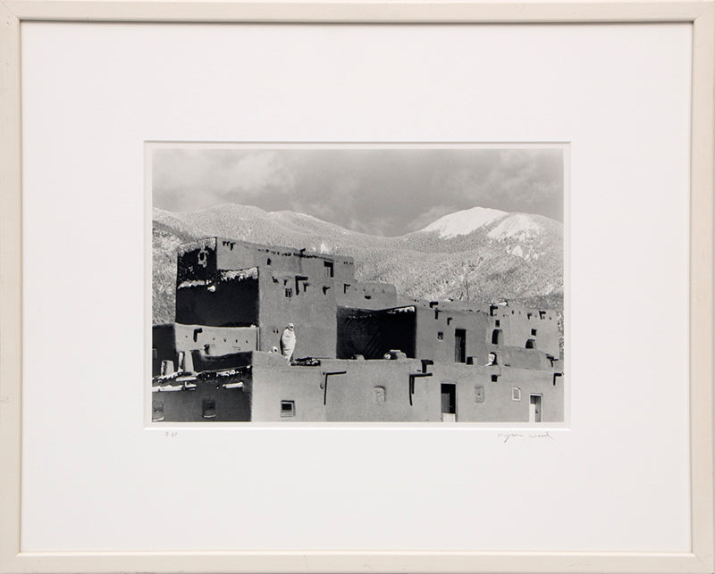 Taos Winter, Taos, New Mexico, original photograph by artist Myron Wood. A view of the adobe buildings at Taos Pueblo in New Mexico with snowy mountains in the background. Signed by the artist, lower right. Presented in a custom frame.