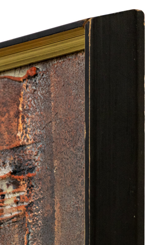 Transfiguration, original abstract painting by Pawel Kontny (Paul Kontny). Vintage painting created with marble dust, gesso and oil glaze on masonite creating a unique raised texture. Painted in neutral tones of brown, beige, yellow, and grey. Presented in the original black and gold frame.