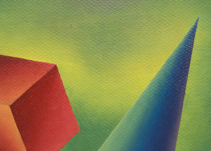 Basic Form Problem #2, vintage circa 1940 painting attributed to artist Ralph Anderson (1929-2010). The composition depicts a red cube and a blue cone against a green and yellow field. Oil on paper. Presented in a custom hardwood frame with an archival mat.