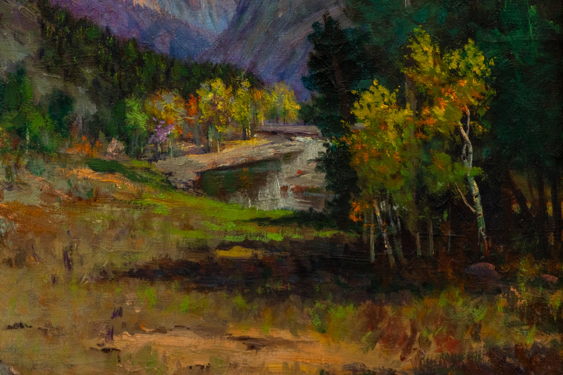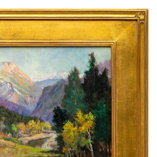Colorado Landscape, original vintage oil painting by Raphael Lillywhite, circa 1920s - 1940s. An autumnal mountan landscape painted in a traditional plein air style, featuring pine and aspen trees with snow capped peaks in the background. Oil on canvas. Signed by the artist, lower left. Presented in a custom vintage frame.