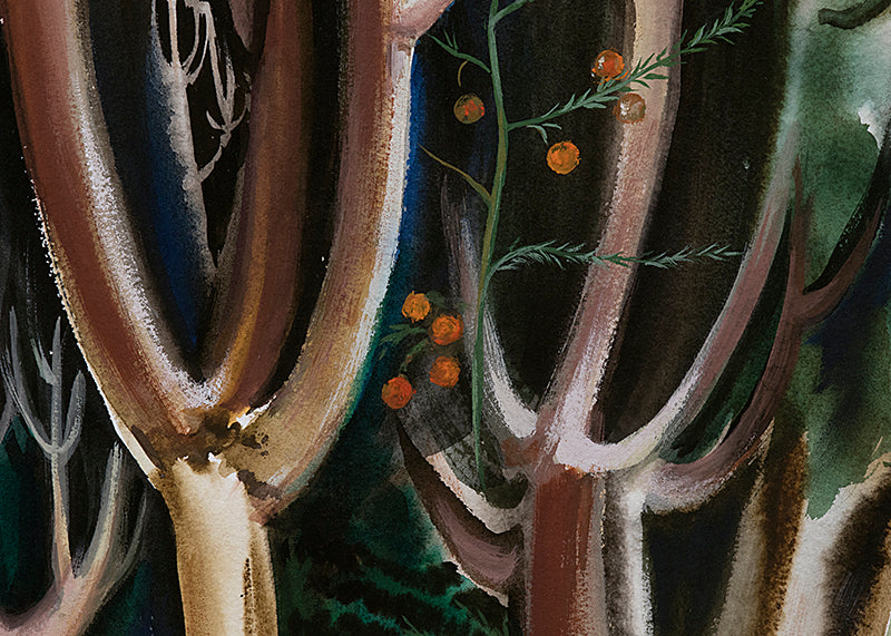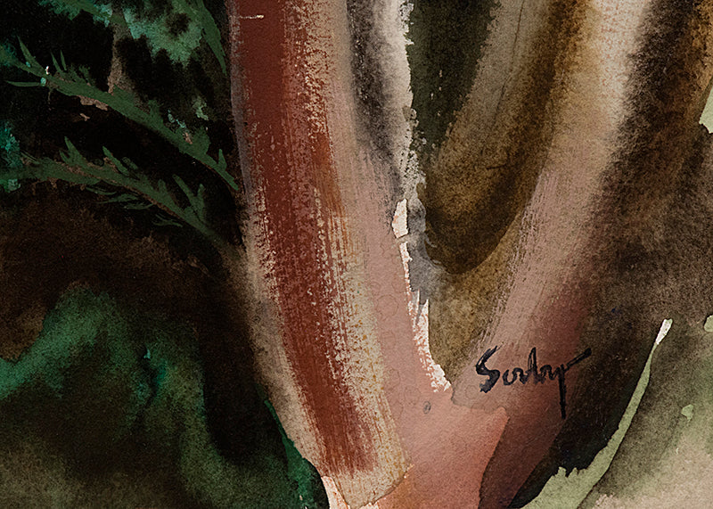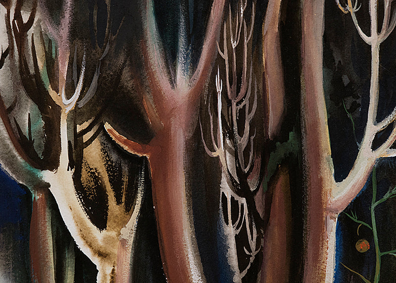 Original vintage circa 1940 painting by Colorado artist Richard Sorby. Modernist in style, the composition depicts a grove of barren winter trees. Watercolor on paper. Signed by the artist, lower right. Presented in a custom frame with an archival mat and anti-reflective glass.