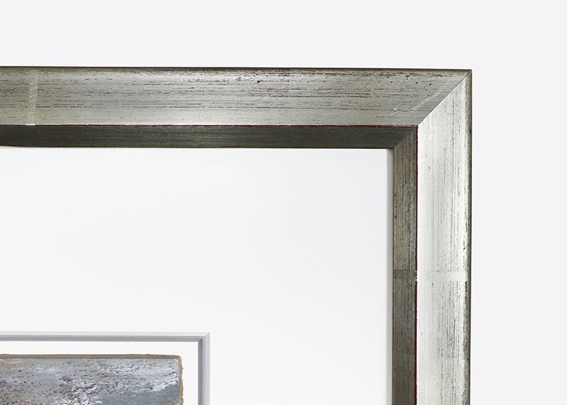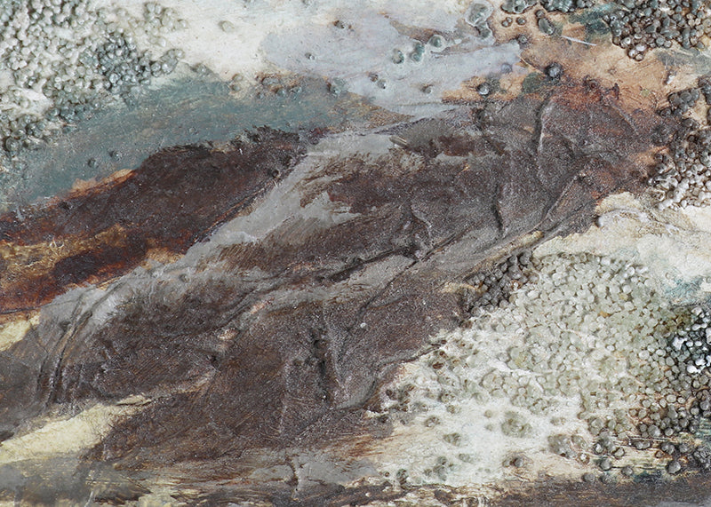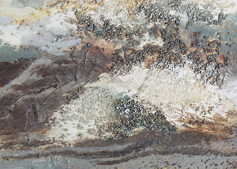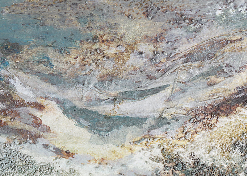 Original mixed media painting by Colorado artist Richard Sorby. Abstract composition in shades of teal, brown, ochre, and white. Oil paint, mika, and sand on board. Presented in a custom frame with archival materials with UV70 protectant glass.