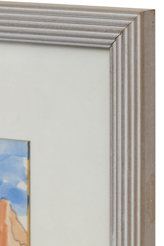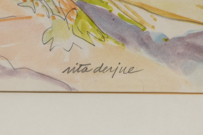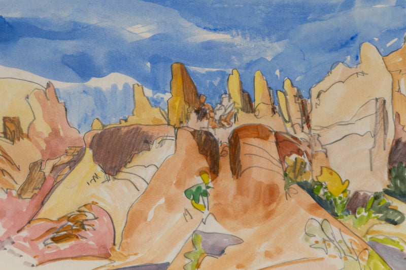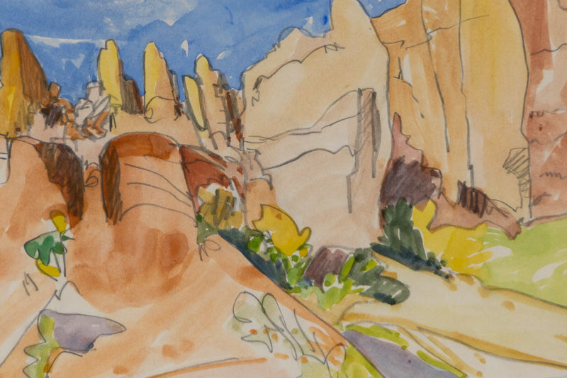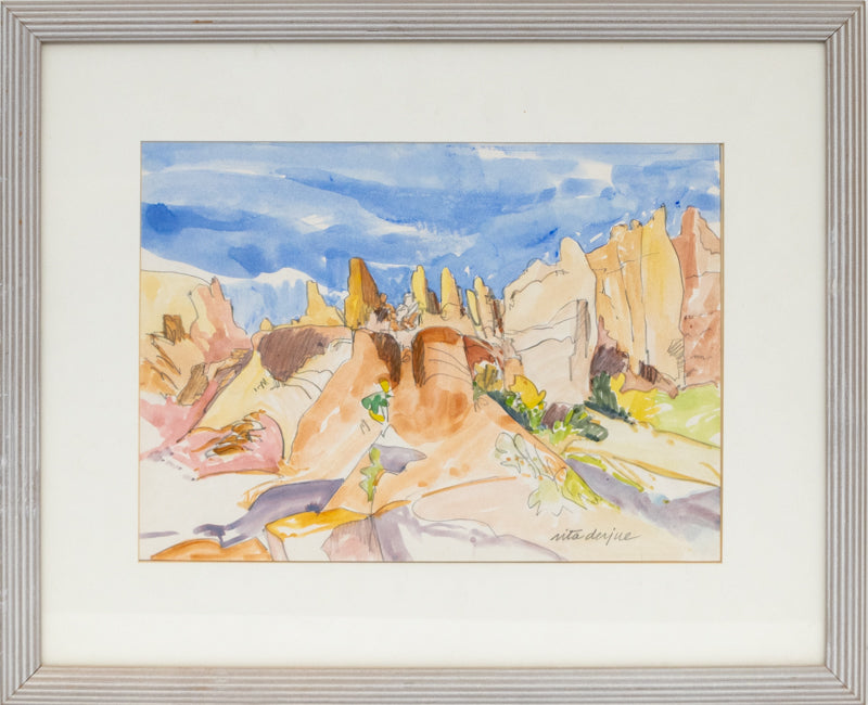 Original landscape painting by Littleton, Colorado artist Rita Derjue. Using shades of sky blue, orange, and brown, the painting depicts the rock formations in Arches National Park, Utah. Watercolor on paper. Signed by the artist, lower right, and titled verso. Presented in a custom gold tone frame.