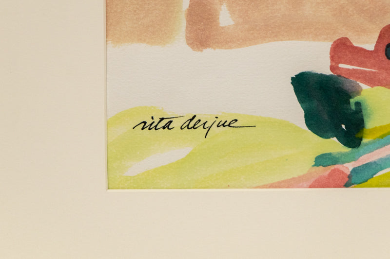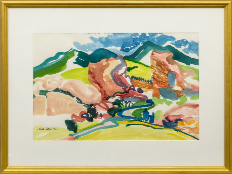 Original painting by Littleton, Colorado artist Rita Derjue. Colorful and warm, this piece captures the iconic landscape of Red Rocks Park near Morrison, Colorado. Watercolor on paper. Signed by the artist, lower left, and titled "Red Rocks" on verso. Presented in a custom frame with archival mat and UV 70 protectant glass.
