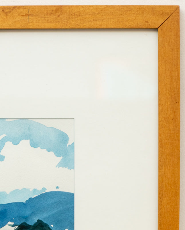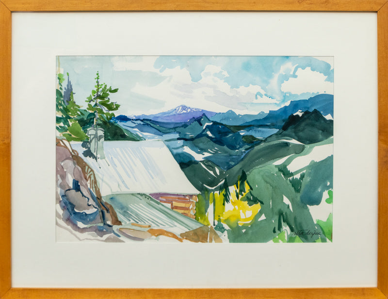 Original painting by Littleton, Colorado artist Rita Derjue. The composition depicts a Colorado cabin and mountain landscape, rendered in sweeping shades of cerulean, sky blue, and pine green. Watercolor on paper. Signed by the artist, lower right. Presented in a custom wood frame with UV 70 protectant glass.