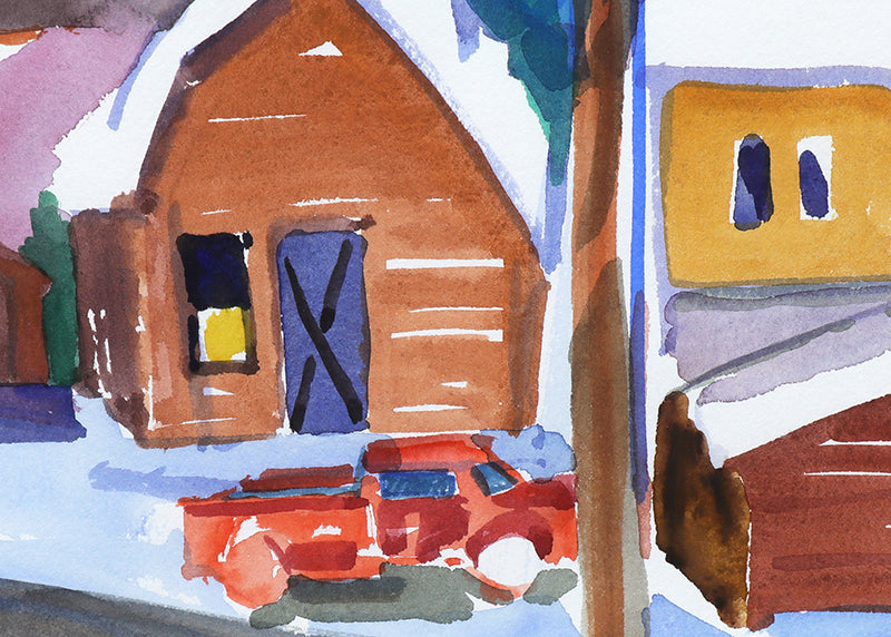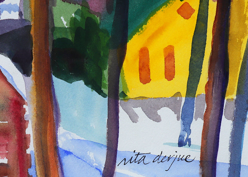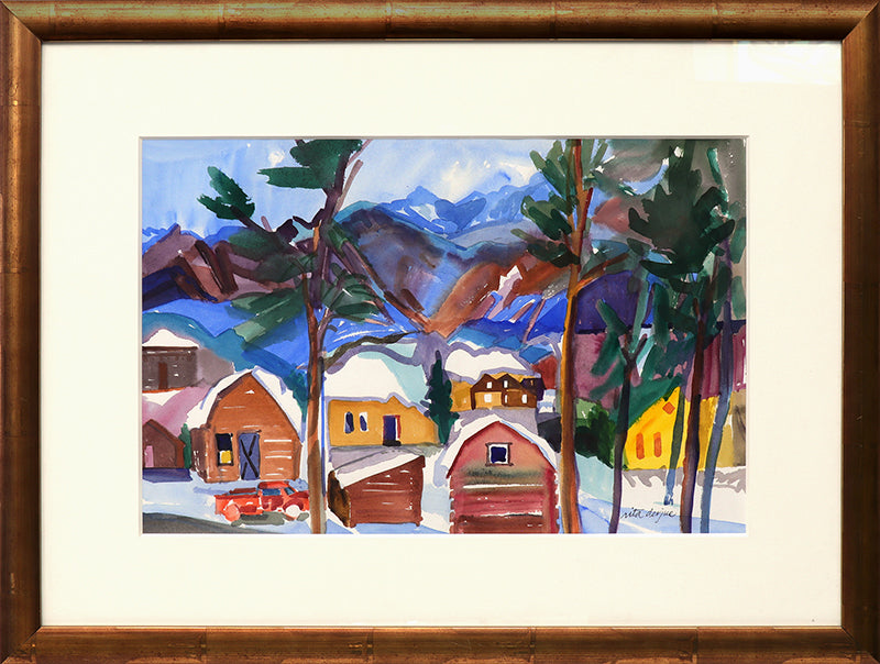 Untitled (Cabins in the Snow, Colorado Mountain Landscape, Winter), original painting by Littleton, Colorado artist Rita Derjue (1934-2020). Colorado winter landscape featuring cabins and pine trees blanketed in snow. Watercolor on paper. Signed by the artist, lower right. Presented in a custom frame with archival materials.