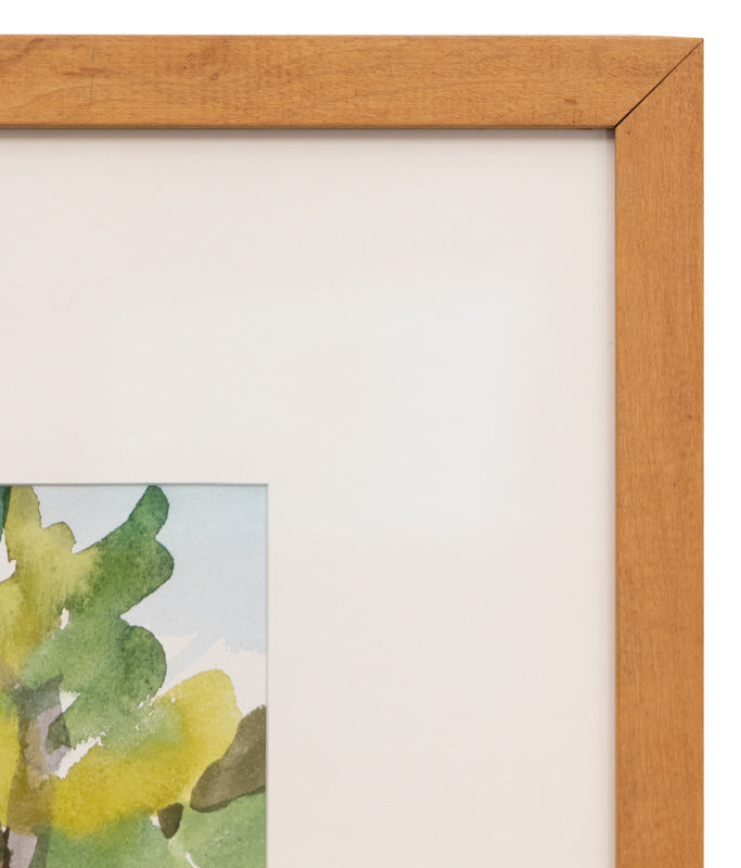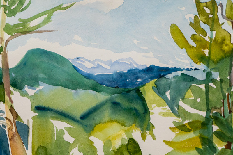 Original painting by Littleton, Colorado artist Rita Derjue. The bright, airy composition depicts a picnic area set in a mountain landscape with a table and pine trees. Watercolor on paper. Signed by the artist, lower left. Presented in a custom frame with UV 70 protectant glass.